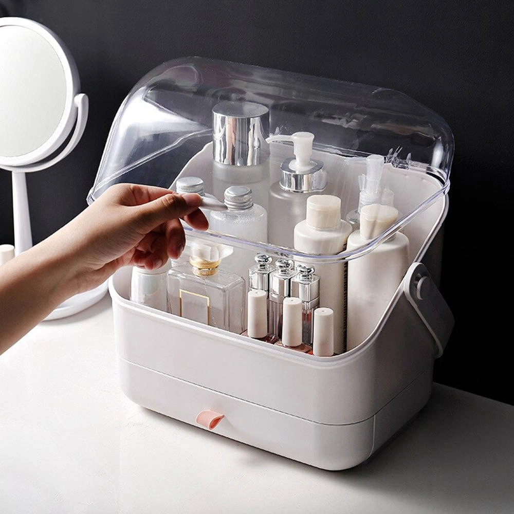 Practical organizer for cosmetics, jewelry or other accessories for every woman. It features a capacious drawer and a large display case for perfumes, lotions or creams. Will keep your handy trinkets neat and tidy.