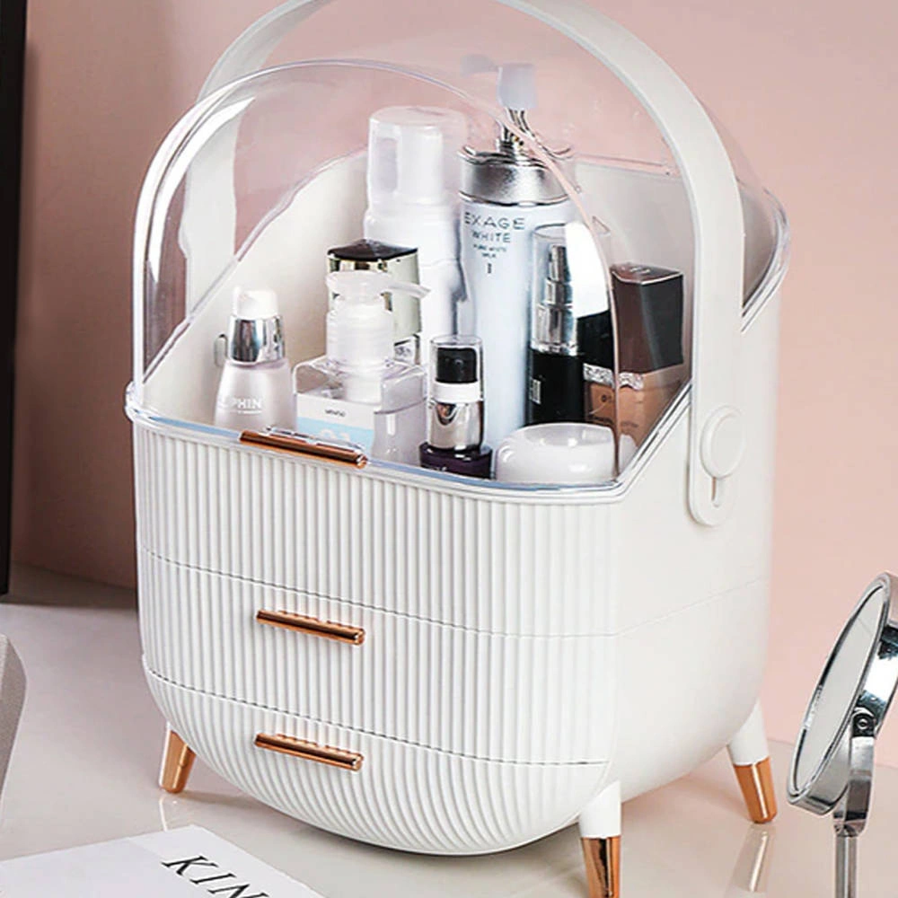 Practical organizer for cosmetics, jewelry or other accessories for every woman. It features capacious drawers and a large display case for perfumes, lotions or creams. Will keep your handy trinkets neat and tidy.