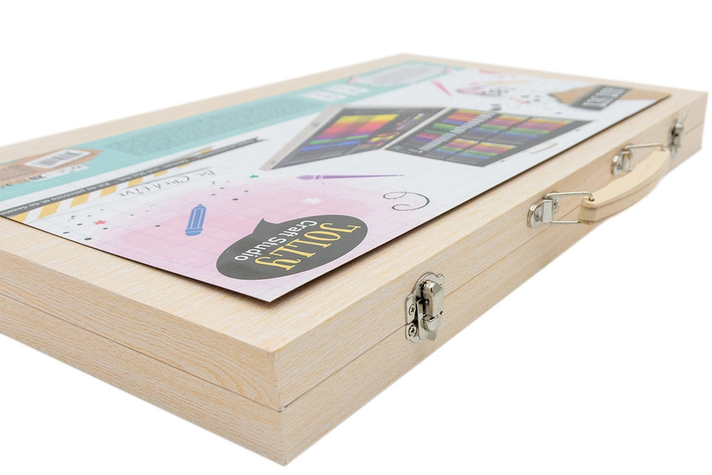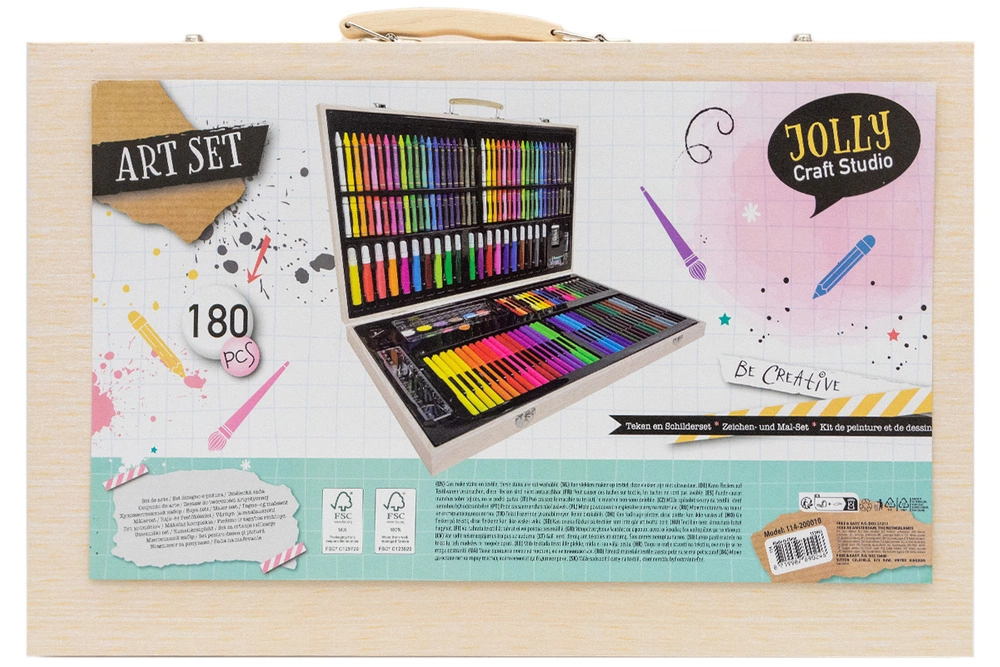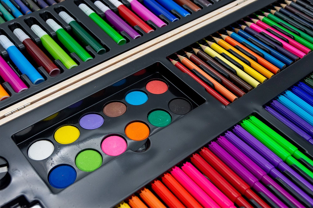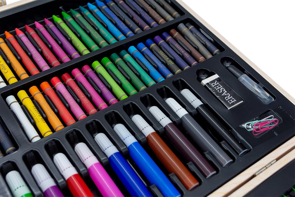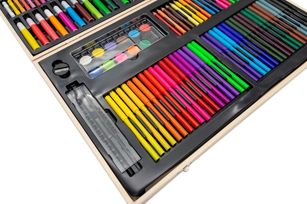 Wooden suitcase painting set is perfect for any arts and crafts lover. Includes 180 items, including water paints, brush, crayons, markers, pastels and accessories to create unique works of art. Each piece of the set has been carefully selected to ensure the highest quality and versatility in painting and drawing.