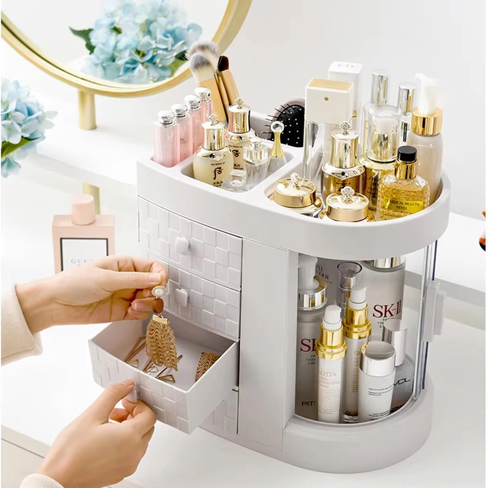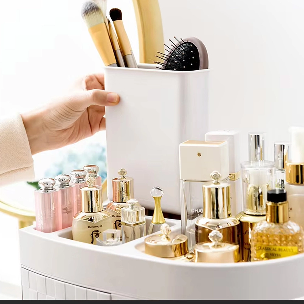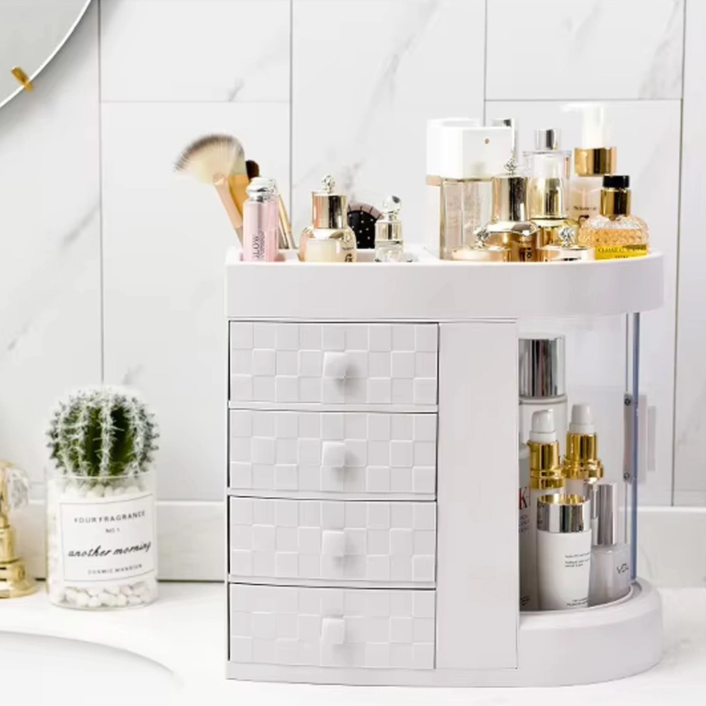 Maya cosmetics organizer is an elegant and organized way to store all your cosmetics. It has four drawers, a rotating lid and an easy-to-clean design. With its modern and minimalist design, the Maya Cosmetics Organizer is perfect for any dressing table or bathroom countertop. Its clever design allows you to access all your cosmetics and beauty supplies in one place, keeping things neat and tidy.