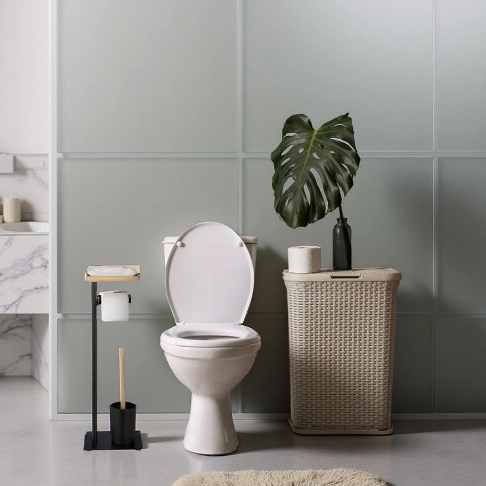 A practical and stylish 2-in-1 solution for any bathroom! Stand made of durable powder-coated metal and natural bamboo. Equipped with a toilet paper holder, a toilet brush enclosed in an elegant container and a practical shelf for small items such as a phone or air freshener. Stable construction with non-slip feet guarantees comfortable and safe use. Great for modern and minimalist arrangements. Compact size saves space.