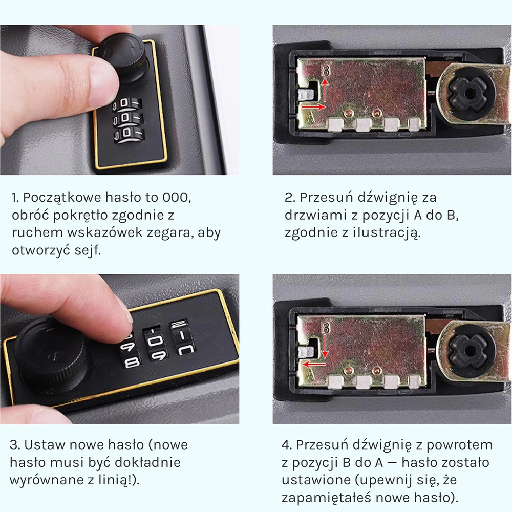The safe is equipped with a 3-digit code lock, which allows you to secure the contents easily and quickly without the need for a key. You can set the code yourself.