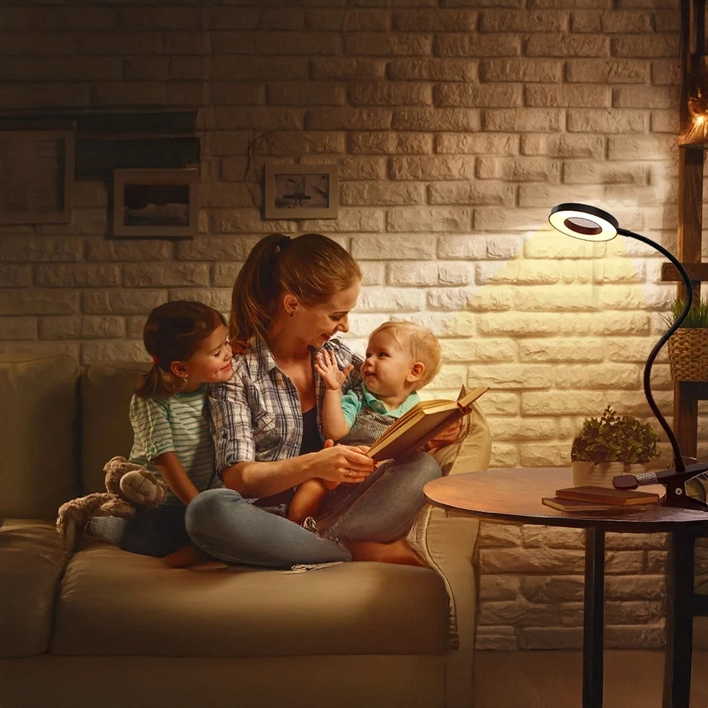 Professional LED ring light with clip, ideal for makeup, reading and work - offers three color temperatures (warm, neutral, cold) and stepless brightness adjustment. Lightweight, functional and convenient to install.