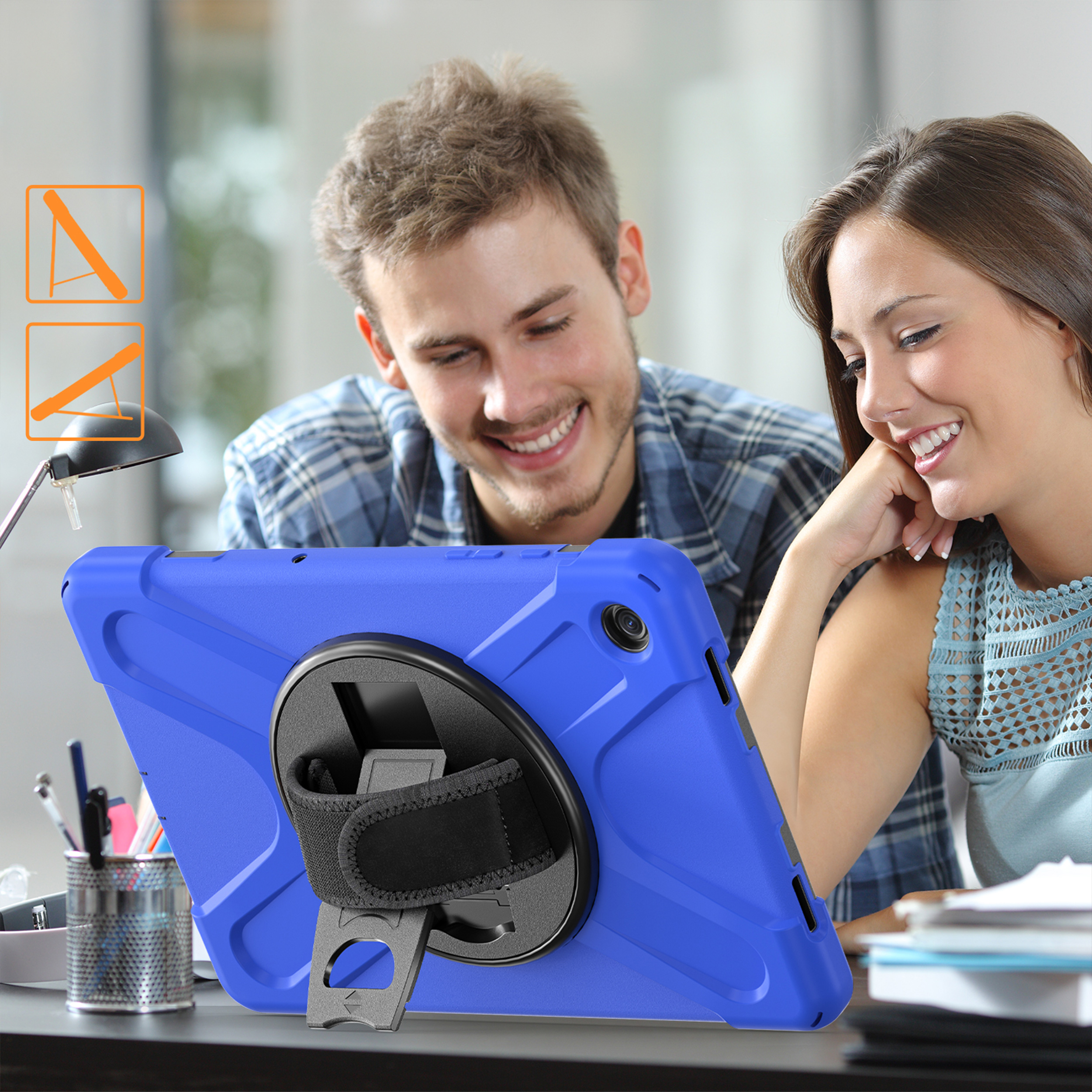 Wytrzymałe etui pancerne Shockproof to niezawodna tarcza dla Twojego tabletu. Dzięki połączeniu materiałów TPU i PC urządzenie jest świetnie zabezpieczone w codziennym użytkowaniu. Konstrukcja zapewnia komfortowy dostęp do wszystkich funkcji, a obrotowa nóżka oraz pasek na dłoń zwiększają wygodę podczas pracy, nauki i rozrywki.