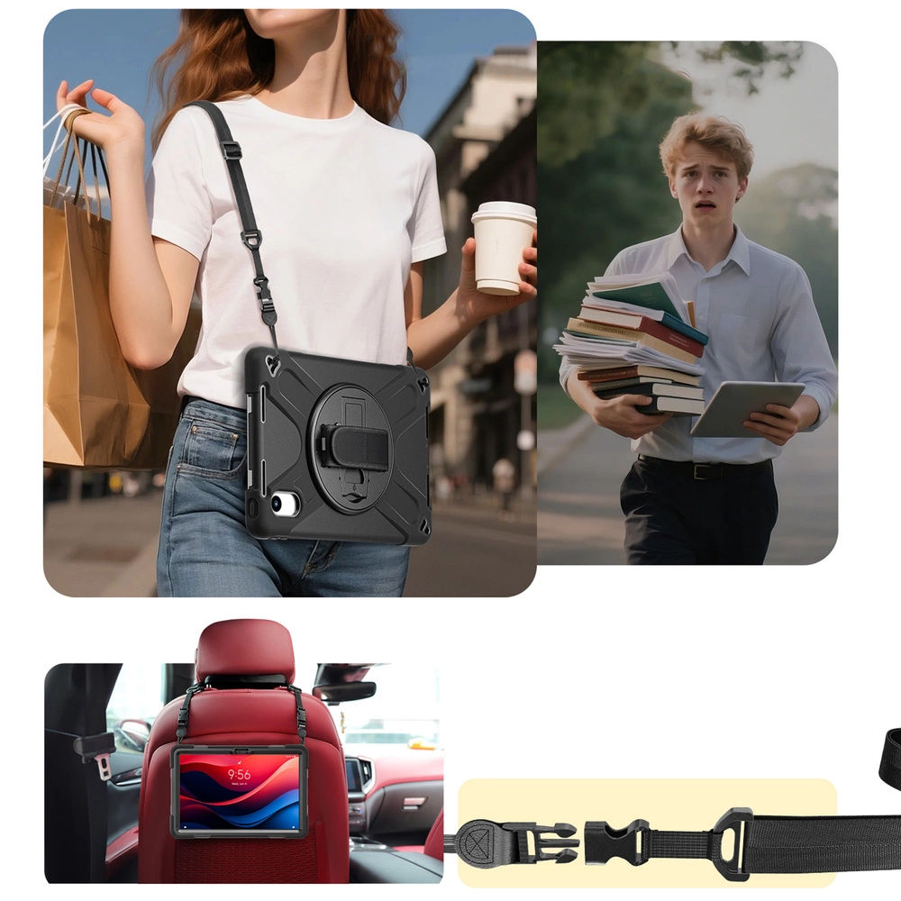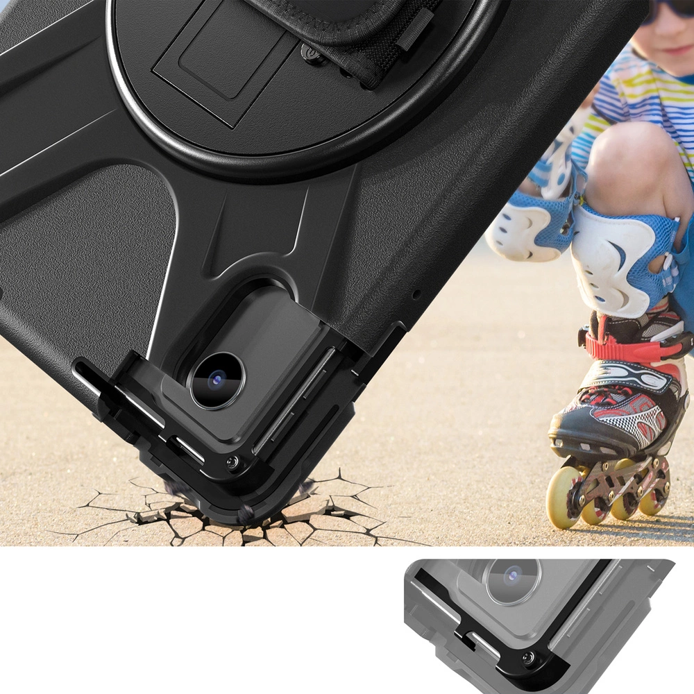 Wytrzymałe etui pancerne Shockproof to niezawodna tarcza dla Twojego tabletu. Dzięki połączeniu materiałów TPU i PC urządzenie jest świetnie zabezpieczone w codziennym użytkowaniu. Konstrukcja zapewnia komfortowy dostęp do wszystkich funkcji, a obrotowa nóżka oraz pasek na dłoń zwiększają wygodę podczas pracy, nauki i rozrywki.