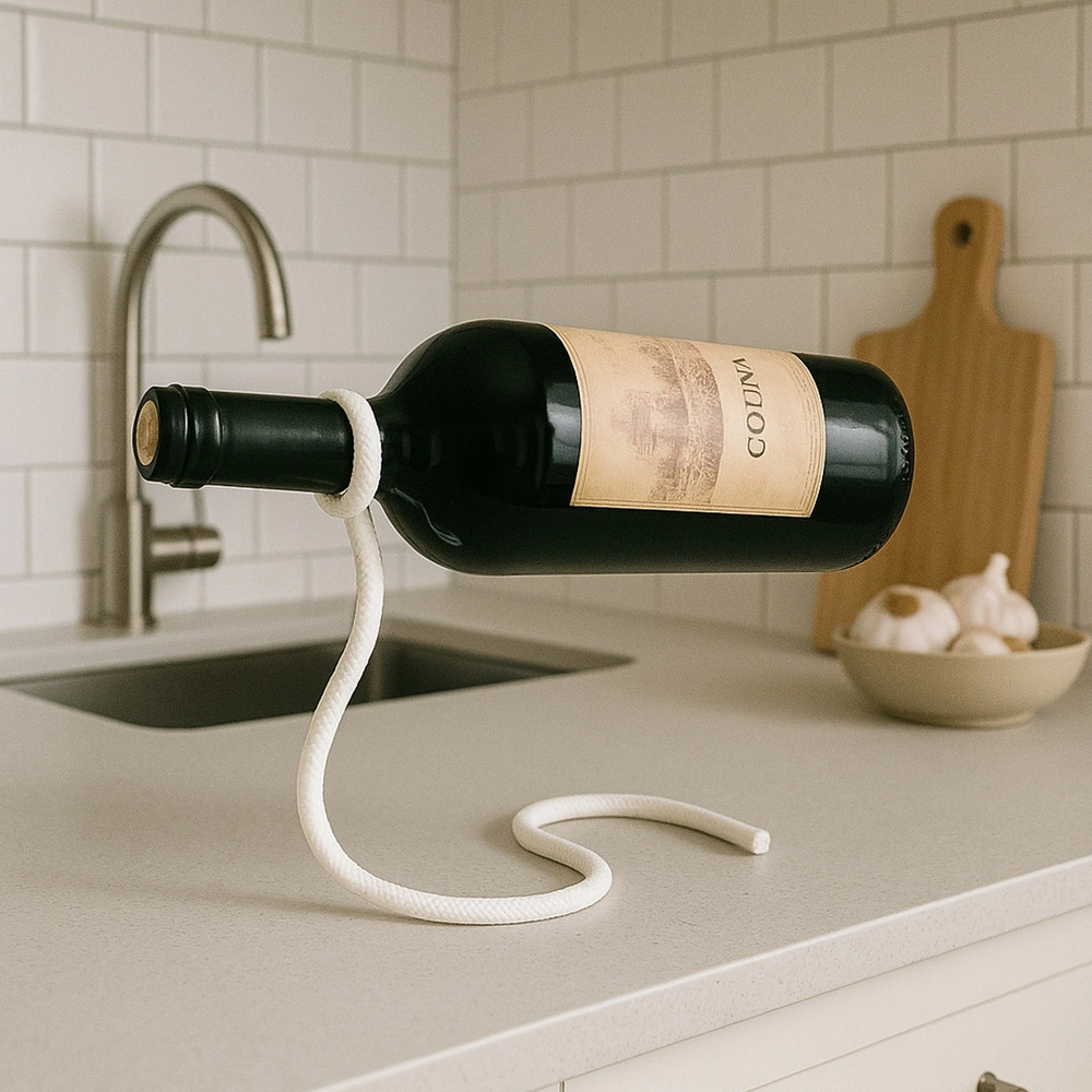 Stojak na wino LASSO to dekoracyjna metafora — balans pomiędzy rzeczywistością a iluzją. Butelka zawieszona w powietrzu jakby zatrzymała czas, dryfując w subtelnym uchwycie splecionego sznura.