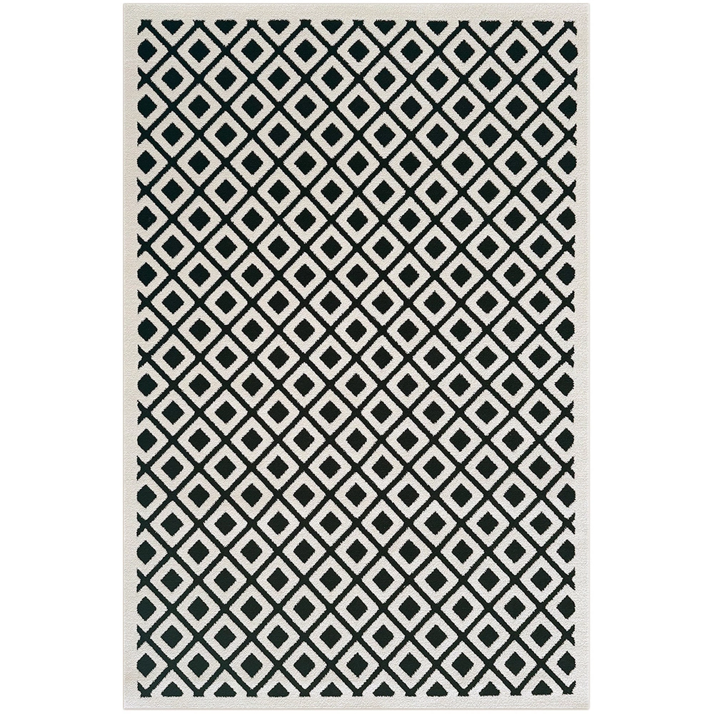 - Jasne tło dywanu rozjaśnia przestrzeń, a geometryczny motyw przełamuje prostotę skandynawskich wnętrz.