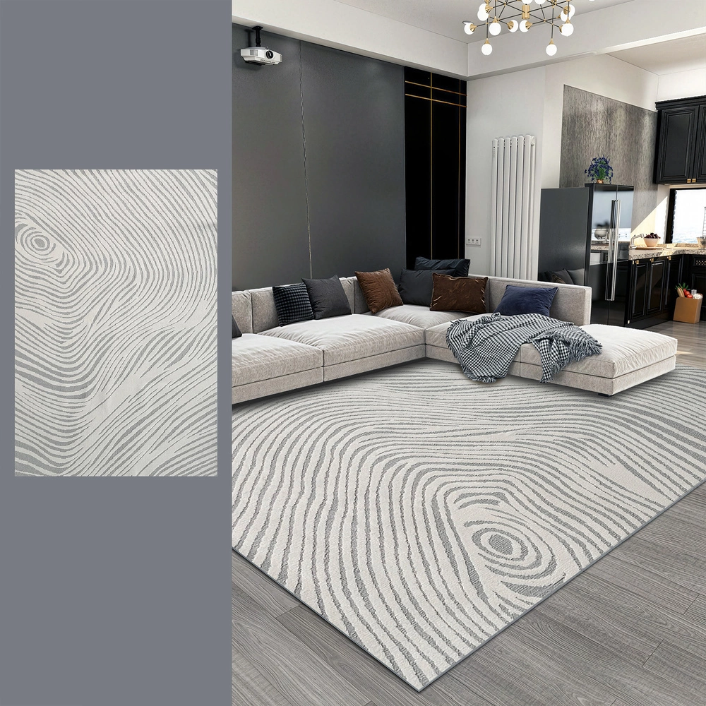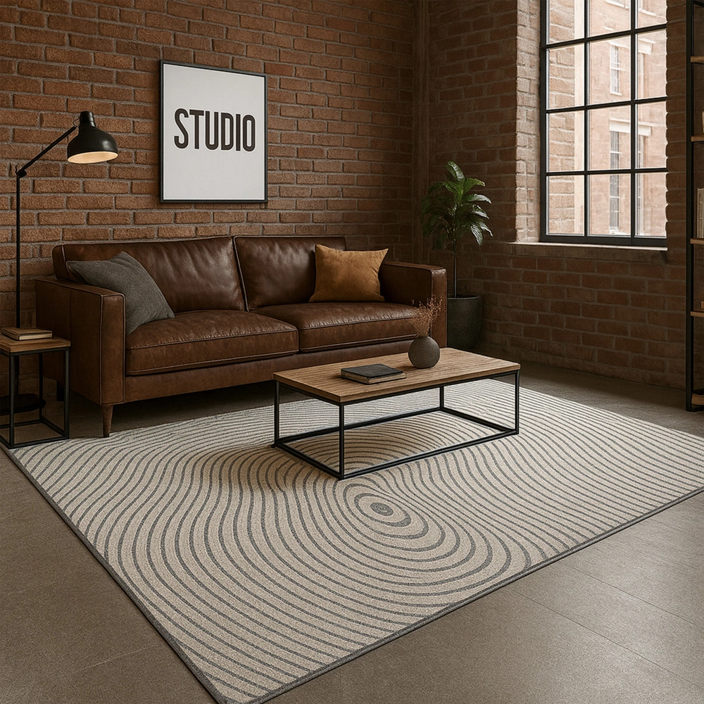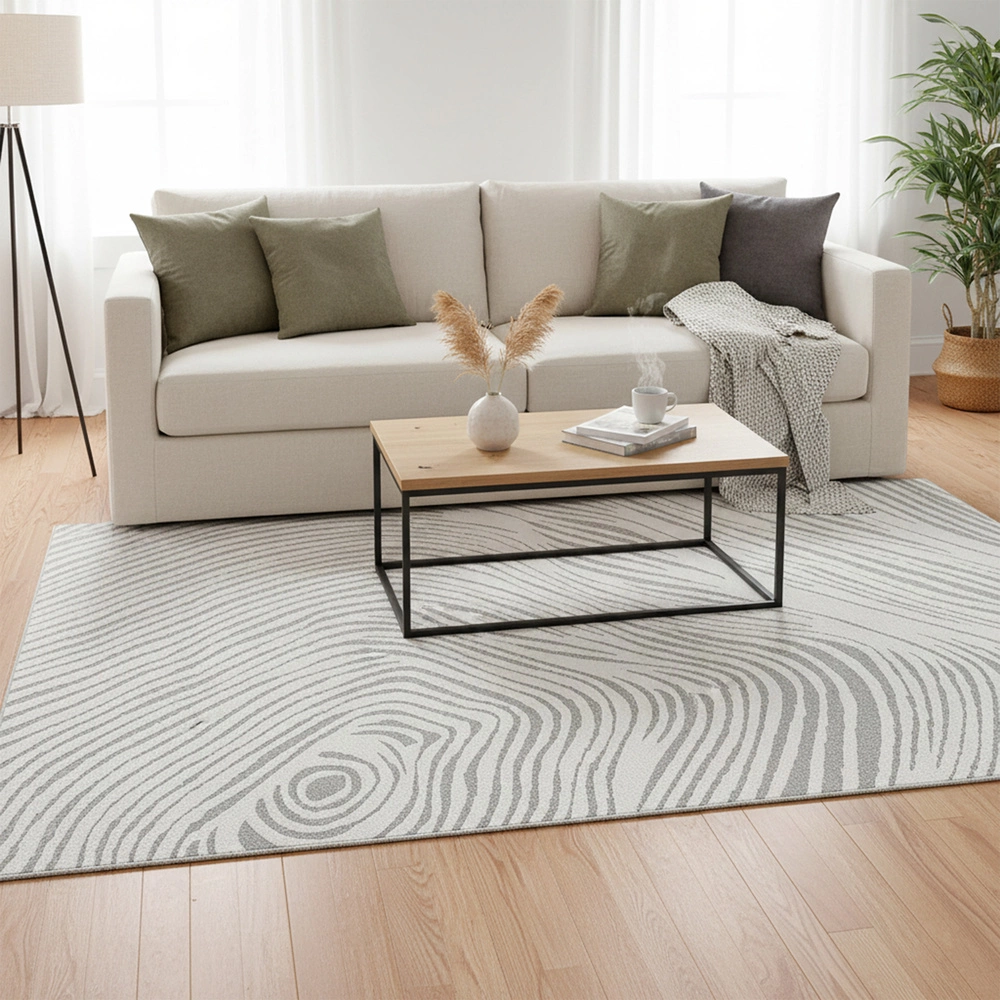 - Dywan z motywem słojów drewna będzie centralnym punktem aranżacji.
