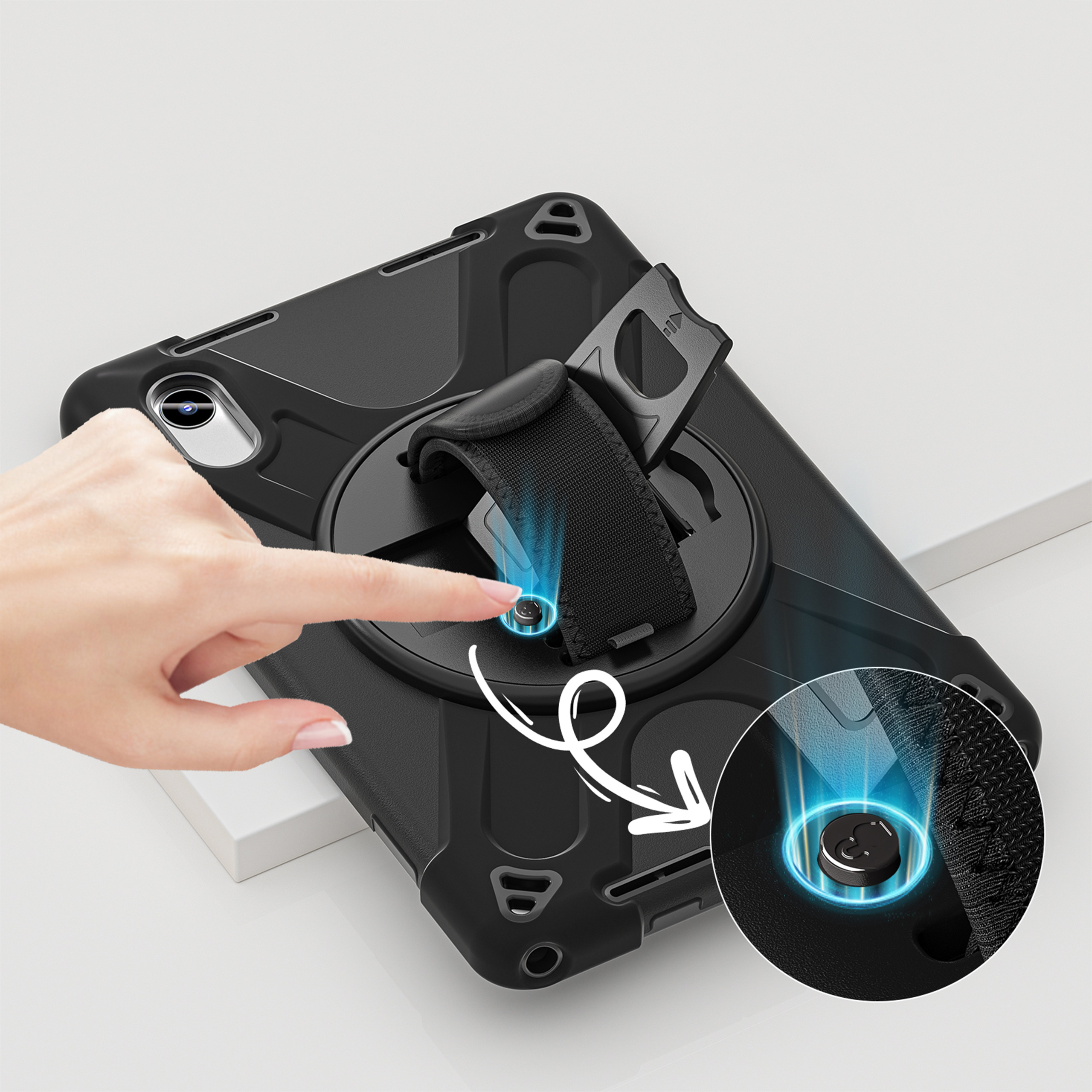 Wytrzymałe etui pancerne Shockproof to niezawodna tarcza dla Twojego tabletu. Dzięki połączeniu materiałów TPU i PC urządzenie jest świetnie zabezpieczone w codziennym użytkowaniu. Konstrukcja zapewnia komfortowy dostęp do wszystkich funkcji, a obrotowa nóżka oraz pasek na dłoń zwiększają wygodę podczas pracy, nauki i rozrywki.