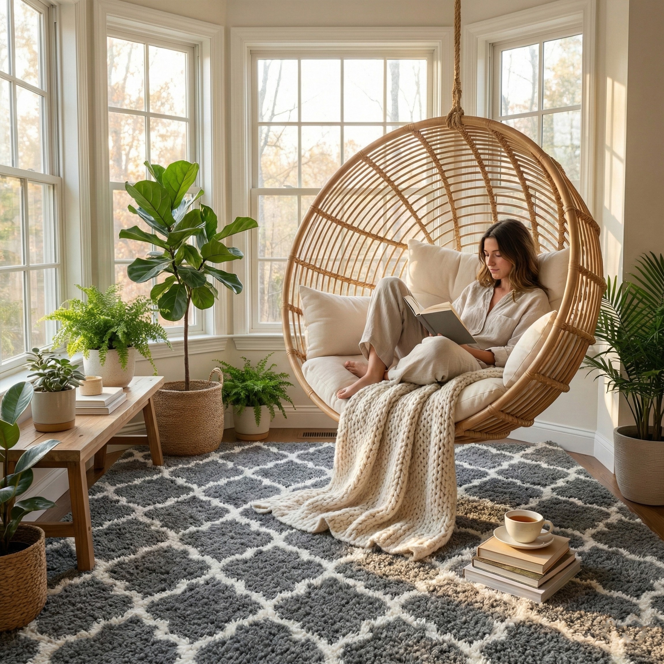 - Gabinet / kącik czytelniczy – pod fotelem, pufą lub przy regale