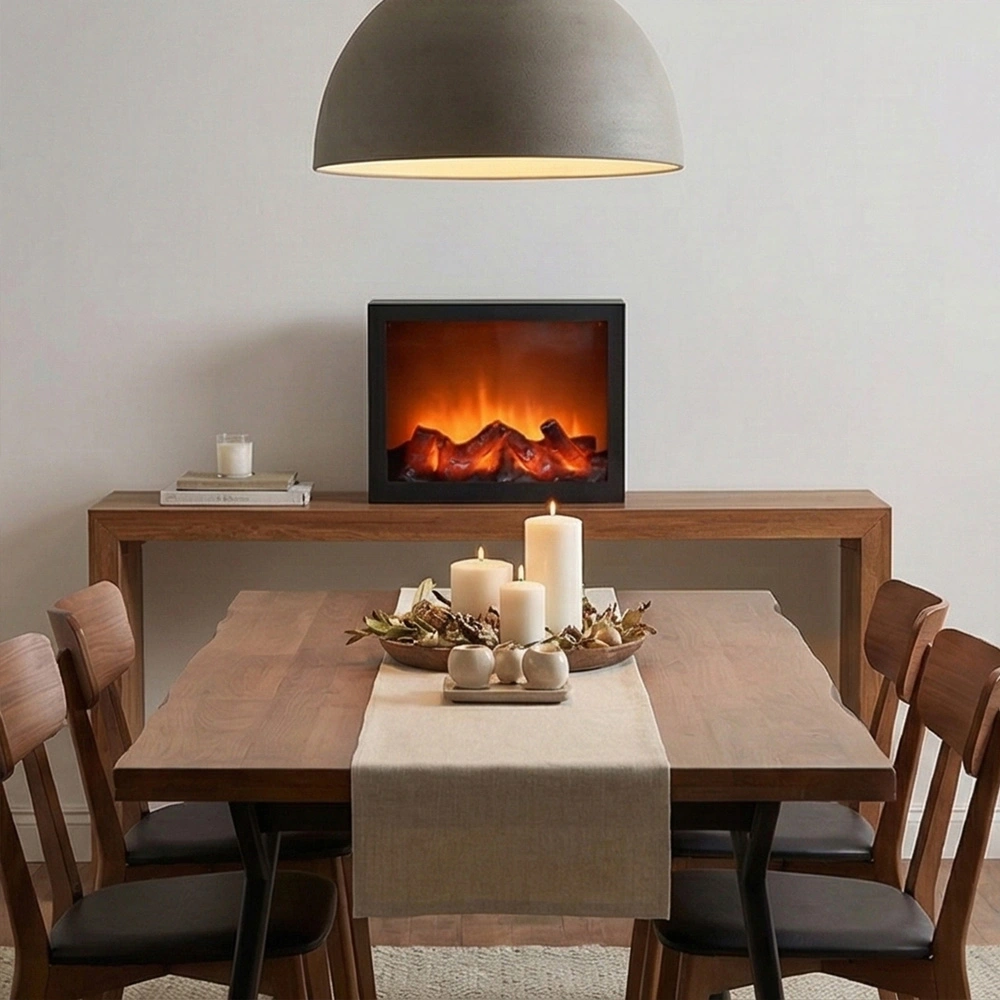 Wbudowane diody LED tworzą naturalnie wyglądający efekt ognia, który wprowadza do wnętrza ciepło i relaksujący nastrój — bez ryzyka poparzenia czy bałaganu związanego z tradycyjnym kominkiem.