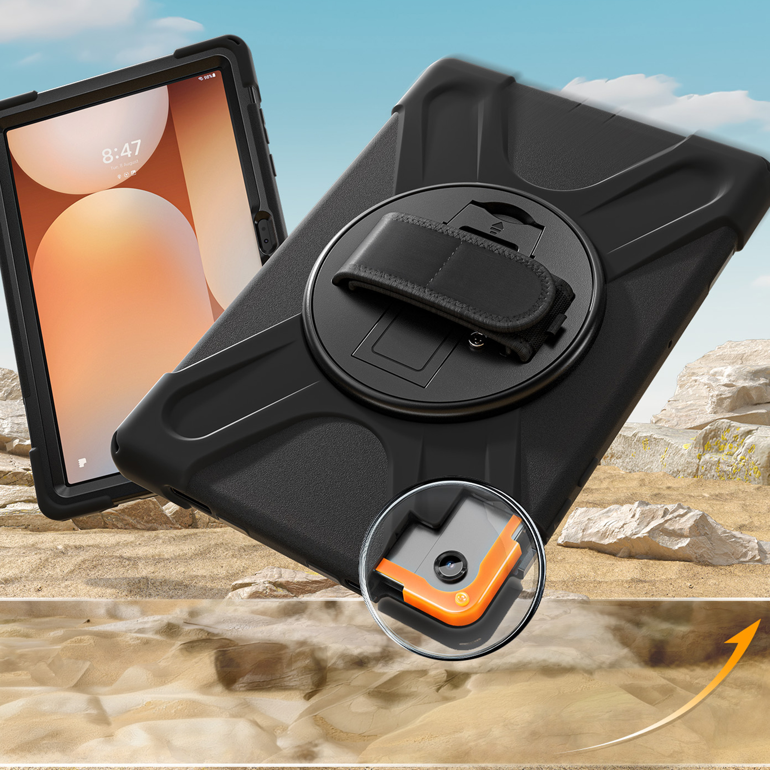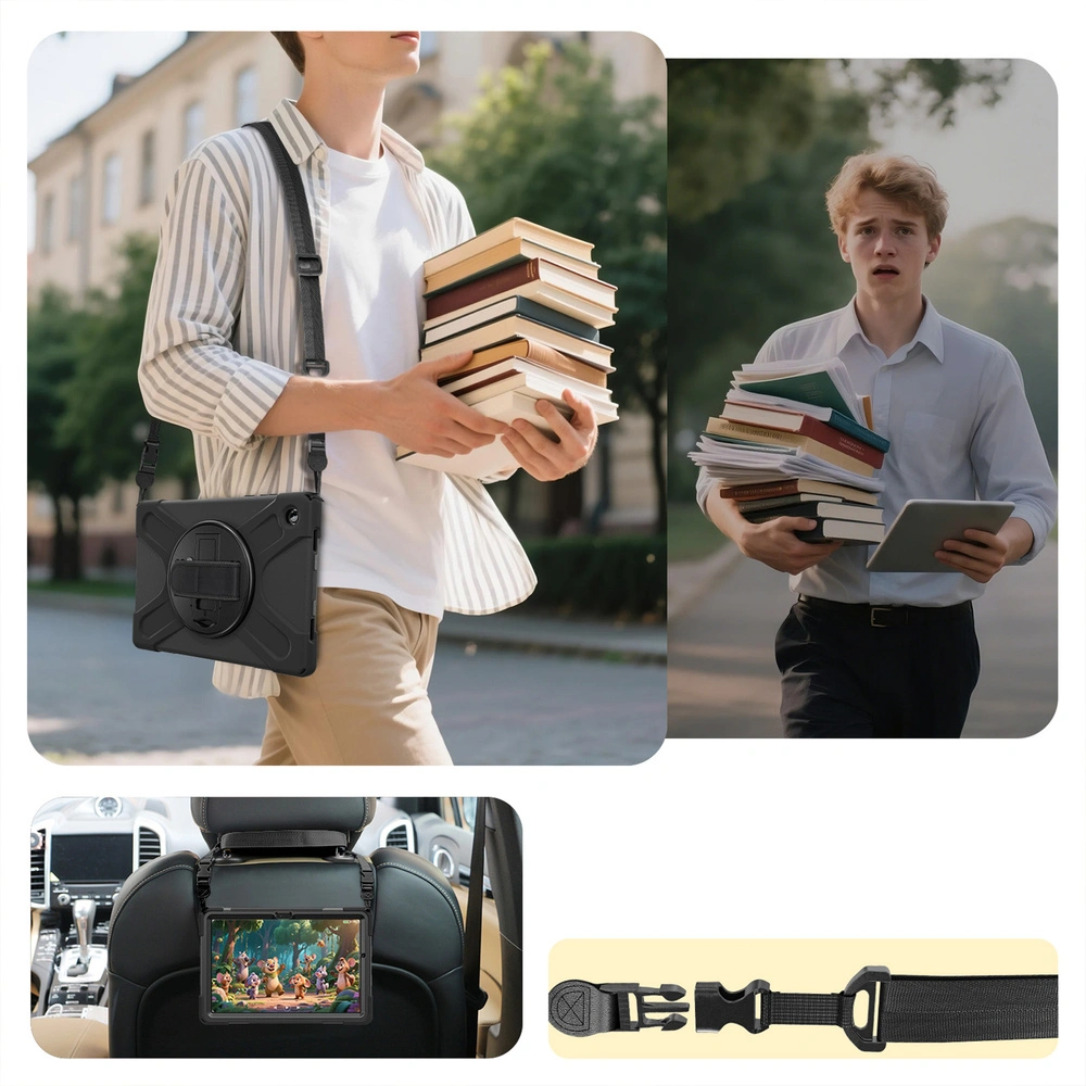 Wytrzymałe etui pancerne Shockproof to niezawodna tarcza dla Twojego tabletu. Dzięki połączeniu materiałów TPU i PC urządzenie jest świetnie zabezpieczone w codziennym użytkowaniu. Konstrukcja zapewnia komfortowy dostęp do wszystkich funkcji, a obrotowa nóżka oraz pasek na dłoń zwiększają wygodę podczas pracy, nauki i rozrywki.