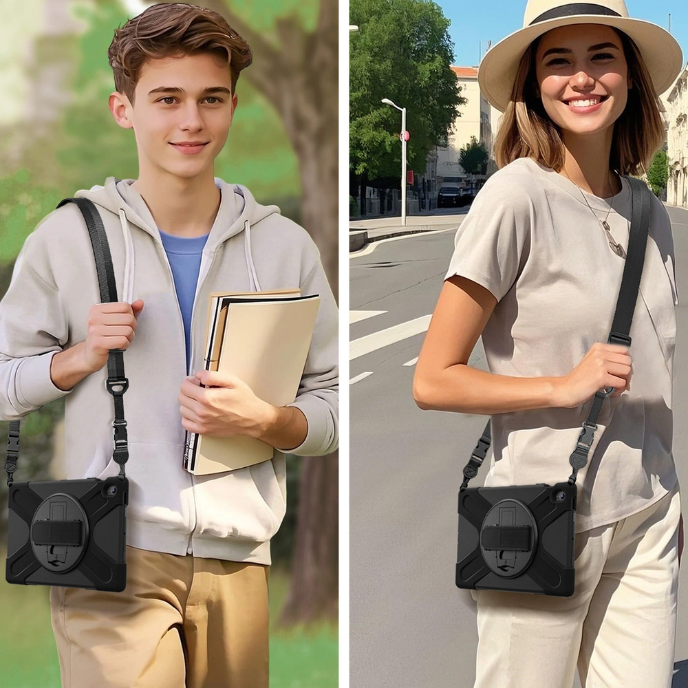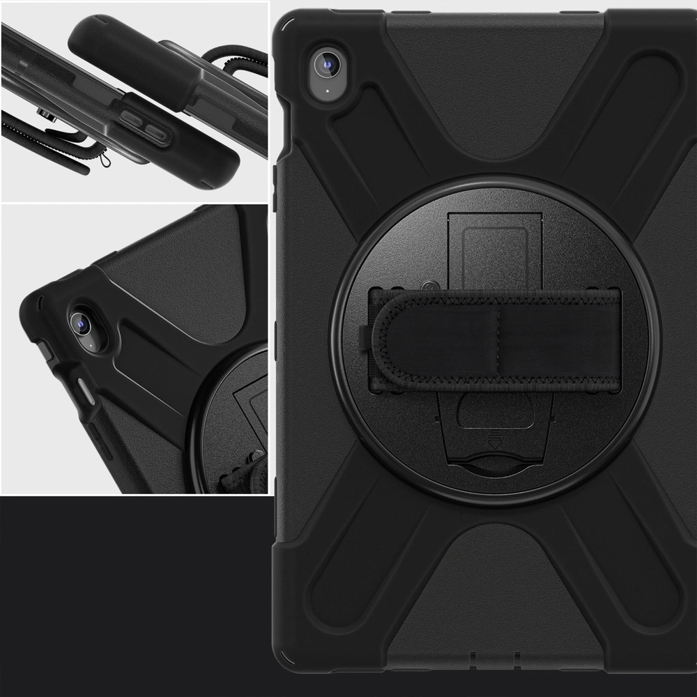 Wytrzymałe etui pancerne Shockproof to niezawodna tarcza dla Twojego tabletu. Dzięki połączeniu materiałów TPU i PC urządzenie jest świetnie zabezpieczone w codziennym użytkowaniu. Konstrukcja zapewnia komfortowy dostęp do wszystkich funkcji, a obrotowa nóżka oraz pasek na dłoń zwiększają wygodę podczas pracy, nauki i rozrywki.