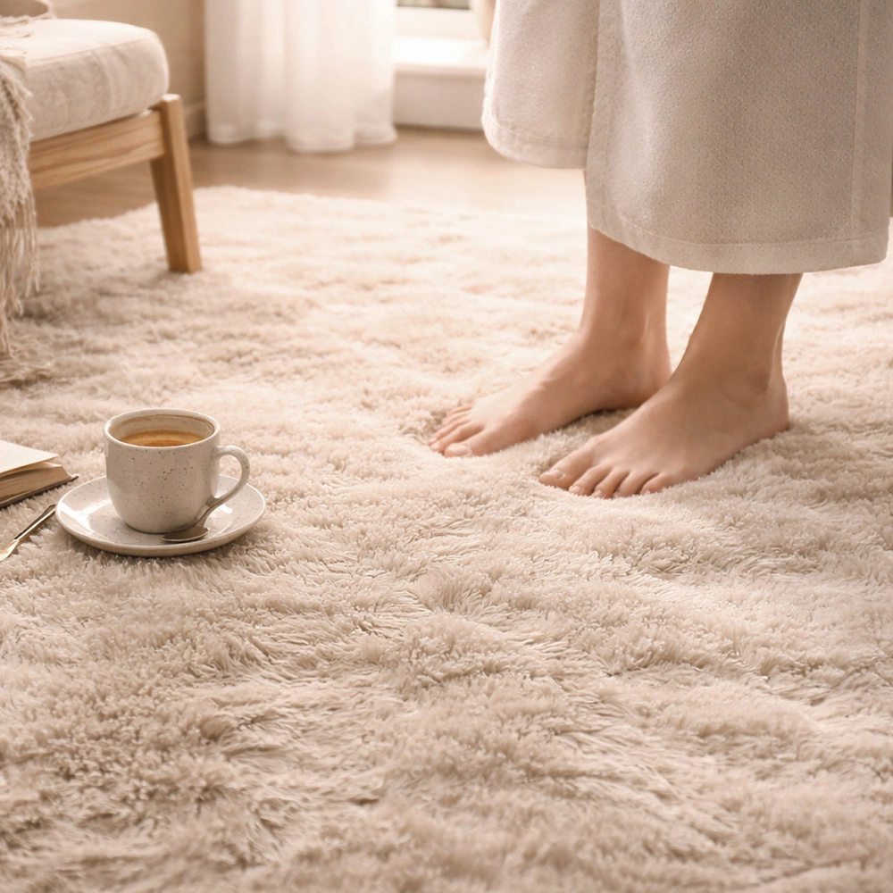 To dywan, który sprawia, że wnętrze wygląda bardziej miękko, cieplej i spokojniej. Dobrze prezentuje się na zdjęciach, ale jeszcze lepsze wrażenie robi na żywo – szczególnie wtedy, gdy możesz stanąć na nim boso po długim dniu i poczuć prawdziwy komfort.