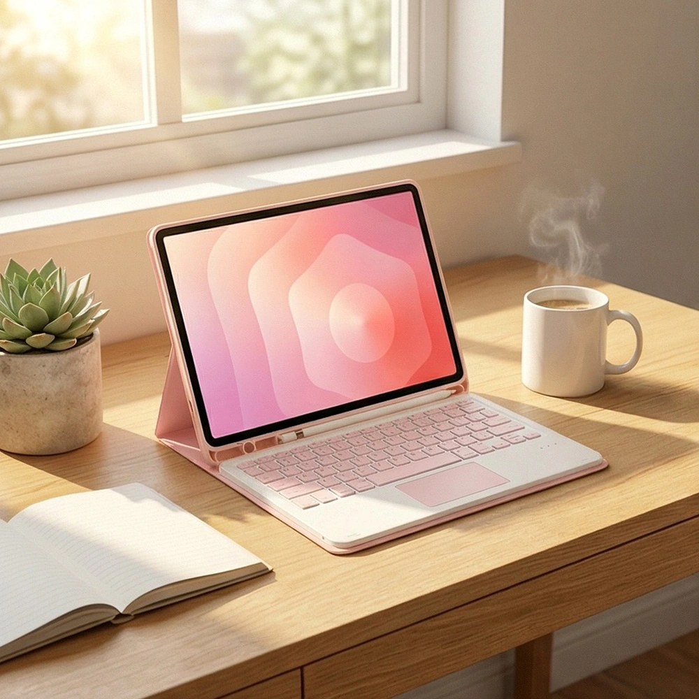 Przekształć swój tablet w wygodne narzędzie do pracy i nauki. Etui typu book ze zintegrowaną klawiaturą Bluetooth i wbudowanym touchpadem zapewnia wygodne pisanie, precyzyjną kontrolę kursora i pewną ochronę urządzenia – w domu, biurze i w podróży.